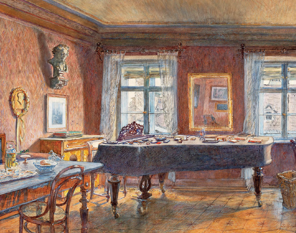 Lo studio di Johannes Brahms del suo ultimo appartamento, raffigurato in un celebre pastello da Carl Müller nel 1904. Si noti il busto di Beethoven posto sopra il pianoforte.