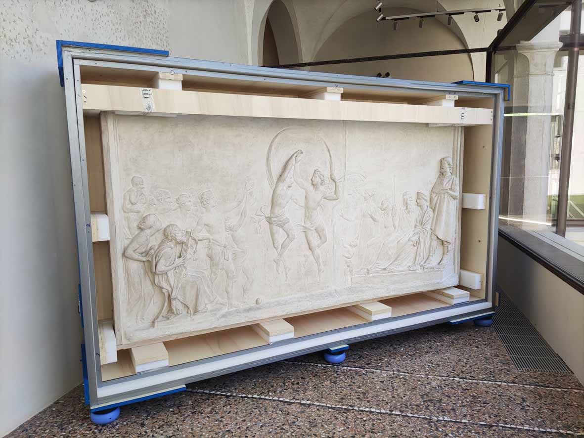 Da ultimo, la mostra trevigiana espone, per la prima volta dopo il restauro, due meravigliosi gessi originali dello scultore, patrimonio delle Assicurazioni Generali, opere di grandi dimensioni (141 x 280 cm), raffiguranti due diversissimi soggetti, l’uno - realizzato dall’artista tra il 1787 e il 1790, raffigurante La morte di Priamo; il secondo, datato al biennio immediatamente successivo, raffigurante La danza dei figli di Alcinoo. Come scrive ancora Fabrizio Malachin nel raffinato ed esaustivo catalogo da Antiga Edizioni, «Il sublime tragico è protagonista della prima composizione, dove domina il dolore e l’angoscia, e con accenti di verità arditi e nuovi, specie nella scelta di rappresentare Pirro totalmente ignudo. Oltre all’ardimento di quel nudo, offerto allo sguardo dell’osservatore con tale evidenza, brani intensissimi sono le figlie di Priamo: a sinistra, con le braccia spalancate verso l’alto implorano pietà, come la Maddalena ai piedi della Croce in un’opera dei “Primitivi”; a destra, fuggono atterrite, una stringe il suo bambino come nelle Stragi degli innocenti; e ancora, all’estrema sinistra, la moglie di Priamo sviene e a stento viene sorretta, ricordo di una Vergine ai piedi della Croce». Ideale continuazione di questo bassorilievo è La danza dei figli di Alcinoo(argomento, questa volta, che esplora la gioia, la grazia, la vivace ilarità). Episodi entrambe ispirati alle vicende della guerra di Troia e all’epopea di Ulisse, attingendo all’Odissea e al II libro dell’Eneide.