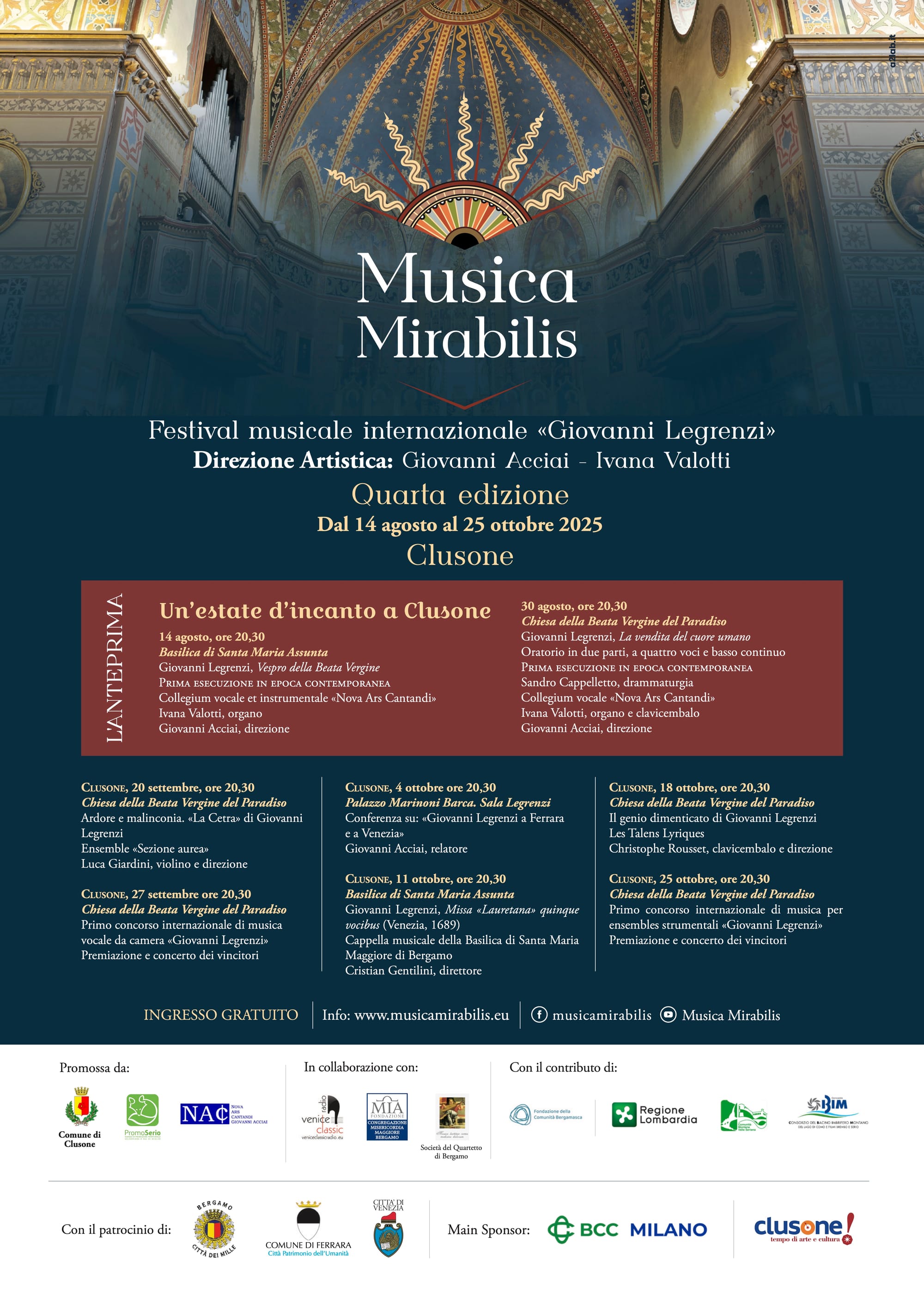 This festival, promoted by the Municipality of Clusone in partnership with PromoSerio and the Nova Ars Cantandi vocal and instrumental ensemble and under the artistic direction of Giovanni Acciai and Ivana Valotti, is defined by its solemn aim to honour Giovanni Legrenzi’s invaluable musical legacy—rarely performed in contemporary times—while simultaneously fostering a comprehensive exploration of his work through concerts, historical insights, and cultural initiatives, all supported by strong public engagement as evidenced by past editions. Accordingly, it also seeks to achieve specific methodological objectives, presenting itself as a collaborative project built on three essential pillars: the active involvement of the Clusone community, the pursuit of excellence, and the aspiration to generate well-being and development opportunities for the local area.