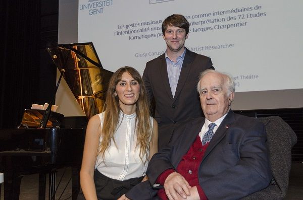 L’approccio a questo monumentale lavoro per pianoforte ha richiesto una vera e propria ricerca di tipo musicologico e di prassi esecutiva. In questi anni, l’interpretazione dei 72 Études Karnatiques è divenuto, infatti, il fulcro della mia ricerca artistica svolta in Belgio presso l’IPEM, dipartimento di musicologia dell’Università di Gand in collaborazione con il Conservatorio Reale (KASK). Per chi volesse approfondire il tema, sono disponibili due miei articoli di ricerca musicologica in lingua francese e in lingua inglese. Il primo, Le patrimoine musical indien dans le répertoire pour piano d’Olivier Messiaen et de Jacques Charpentier (2015), pubblicato sulla rivista Cahiers Internationaux de Symbolisme, (http://portail.umons.ac.be/FR/universite/partenaires/ciephum/CIS/2015%20-%20140-141-142.pdf), tratta specificatamente l’impatto del patrimonio musicale indiano nella produzione dei due compositori francesi; il secondo articolo Gestures in contemporary music performance: a method to assist the performer’s artistic process (2016), pubblicato sulla rivista Contemporary Music Research, (http://www.tandfonline.com/doi/abs/10.1080/07494467.2016.1257292?needAccess=true) affronta i temi delle mie sperimentazioni e dei miei studi presso il laboratorio dell’IPEM che riguardano la relazione tra intenzionalità e gestualità musicale attraverso l’applicazione della moderna tecnologia del MOTION CAPTURE SYSTEM (https://www.youtube.com/watch?v=tOmF4YeBgvY) per l’analisi gestuale della performance pianistica.
