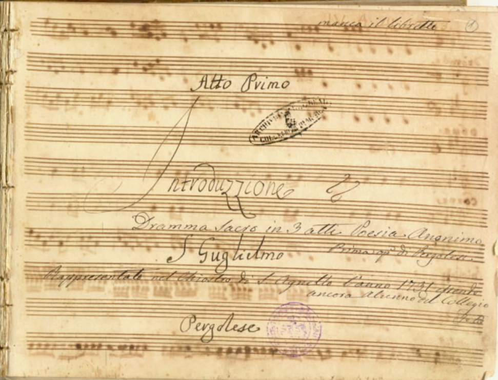 Nel 1731, all’età di ventun anni, Giovanni Battista Pergolesi, alla fine dei suoi fruttuosi studi musicali fatti presso il Conservatorio dei Poveri di Gesù Cristo di Napoli e dopo aver composto la sua prima opera, ossia l’oratorio in due parti La fenice sul rogo, o vero La morte di San Giuseppe, su testo di Antonino Maria Paolucci, dovette affrontare il saggio finale, musicando il dramma sacro in tre atti Li prodigi della divina grazia nella conversione e morte di san Guglielmo duca d’Aquitania, su libretto di Ignazio Maria Mancini. La rappresentazione ebbe luogo nel chiostro del monastero di S. Agnello Maggiore e il successo fu tale che al giovane musicista jesino si spalancarono le porte del Teatro San Bartolomeo, a quel tempo uno dei più popolari e importanti di Napoli, per il quale Pergolesi compose poi la sua prima opera seria, La Salustia.