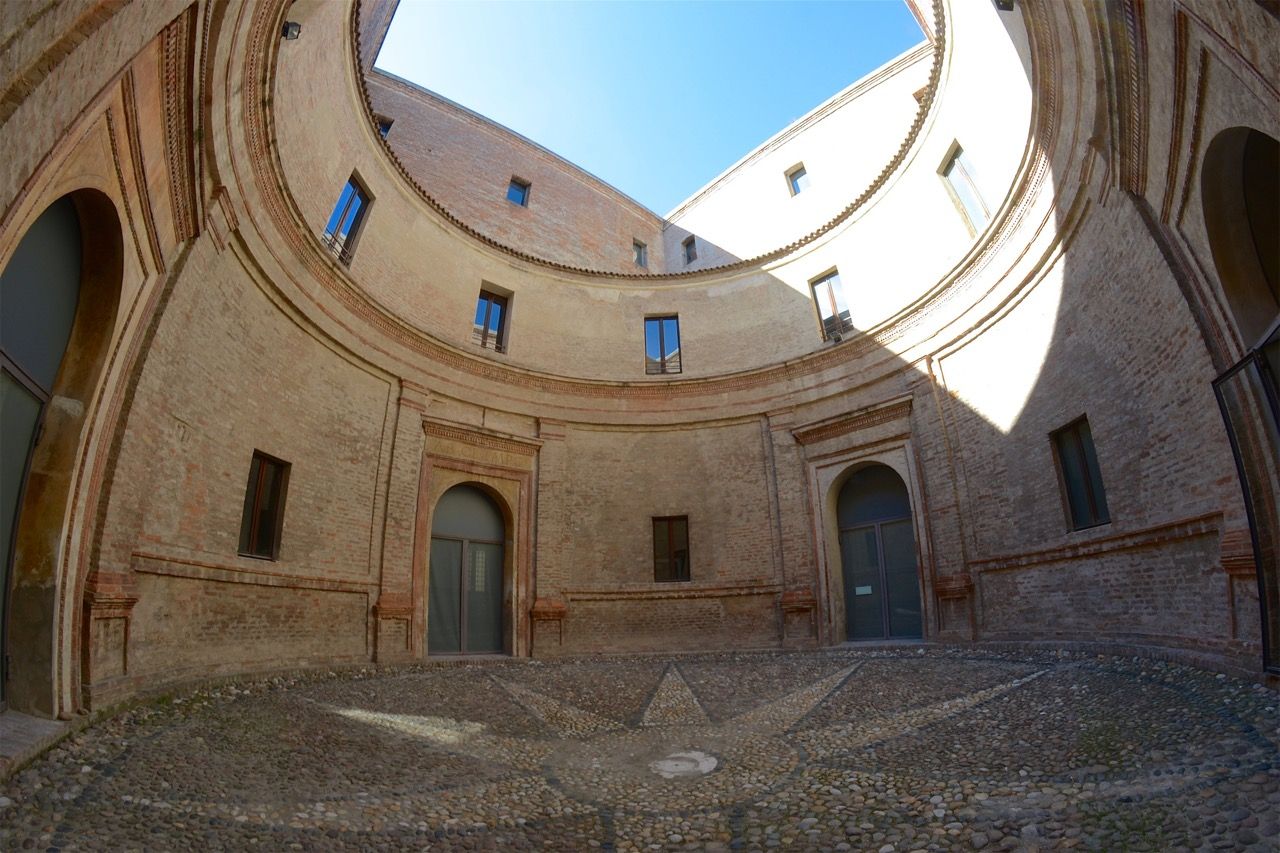 Tale concezione architettonica fu dovuta probabilmente anche dall’influsso che Mantegna ricevette attraverso dei colloqui avuti con Giovan Battista Alberti, il quale nel suo trattato De pictura illustrò, soprattutto nella terza parte, dedicata alla figura del pittore, come l’artista non dovesse essere considerato un semplice artigiano, ma uno spirito creatore, in grado di far trasparire la propria arte anche nelle scelte della vita quotidiana, elevando così la dimensione dell’homo faber a quella di un uomo totalizzante, che può e deve autorappresentarsi anche nelle cose che lo circondano e attraverso le quali il suo animo si impregna. Proprio come accade nella casa in cui abita e in cui opera; ecco, allora, che il palazzo che Mantegna si fece costruire nasce da tale prospettiva artistico-esistenziale, dalla volontà di emanare, fissandolo nelle dimensioni, nei rapporti volumetrici, nelle prospettive spaziali, la propria capacità creativa. E il punto di fuga ideale, quello dal quale osservare tale emanazione architettonica che si propaga in tutta la costruzione è dato appunto dal cortile circolare, vero e proprio atrium della tradizione latina, uno spazio aperto, perfetto, armonioso, che influisce direttamente sull’armonia trasmessa dagli spazi chiusi che lo circondano.