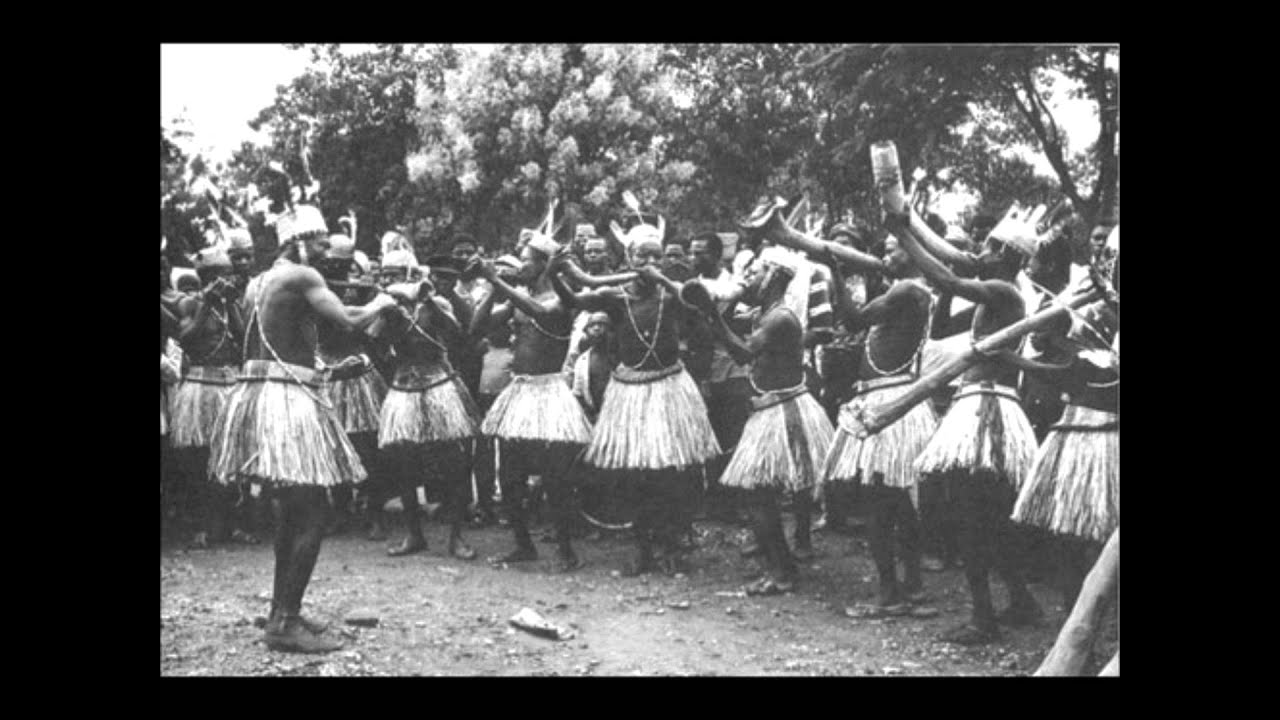 Alcuni suonatori dell'etnia centroafricana Banda-Linda con i loro strumenti a fiato.
