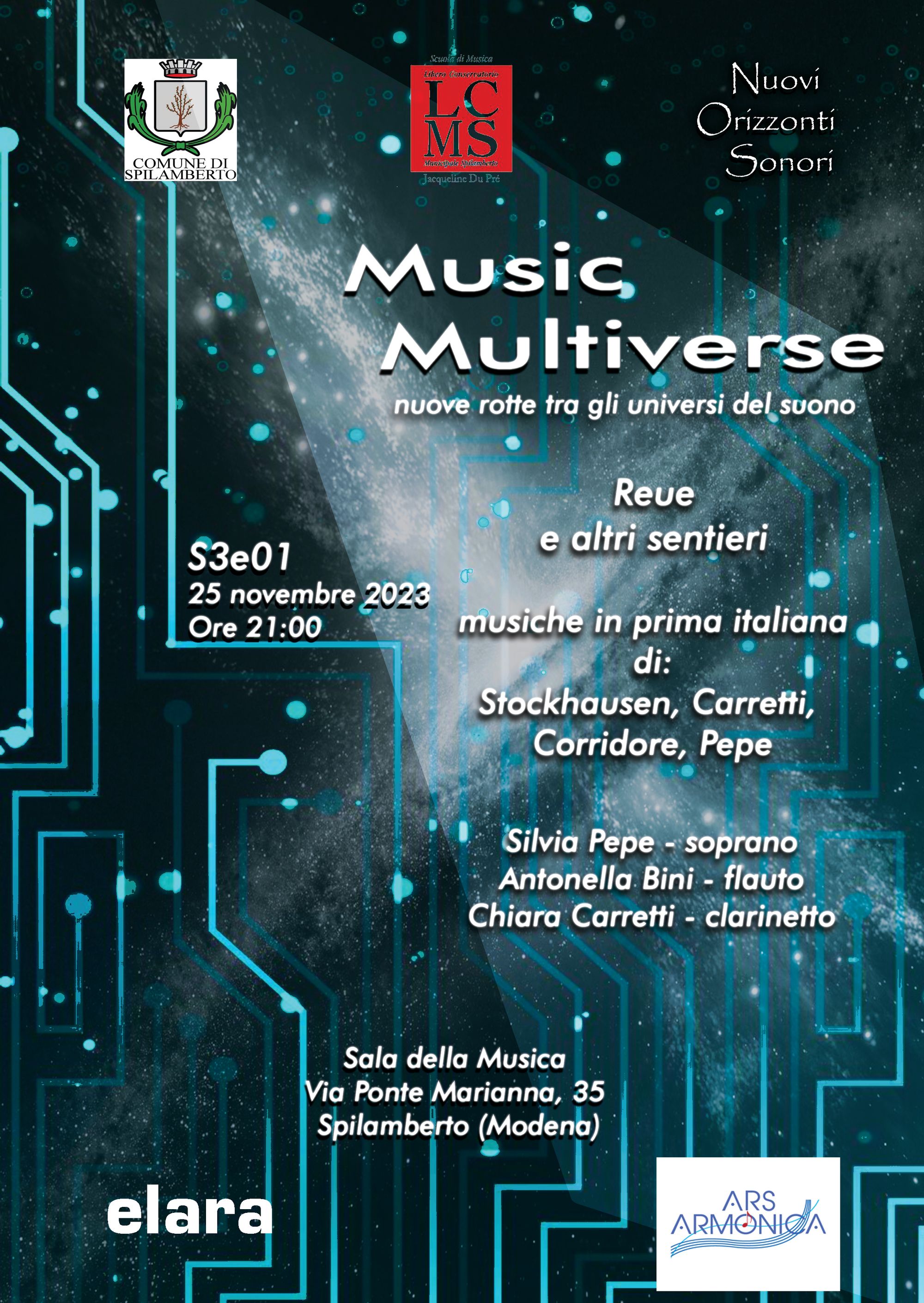 La rassegna Music Multiverse è un contenitore di musica d’arte in cui convergono concerti, conferenze, workshop, incontri divulgativi con compositori e interpreti. Un contenitore - espositore che ha l’obiettivo di far conoscere le peculiarità, nelle forme e nei processi creativi ed estetici, della musica contemporanea soprattutto attraverso l’esecuzione di nuove opere. In Music Multiverse, che è curato da Armando Corridore, confluiscono diverse realtà musicali e non: il festival “Nuovi Orizzonti Sonori”, che dal 2008 si occupa della divulgazione della musica contemporanea nel territorio dell’Emilia Romagna, il conservatorio “Jacqueline Du Prè” di Spilamberto, la casa editrice Elara di Bologna.