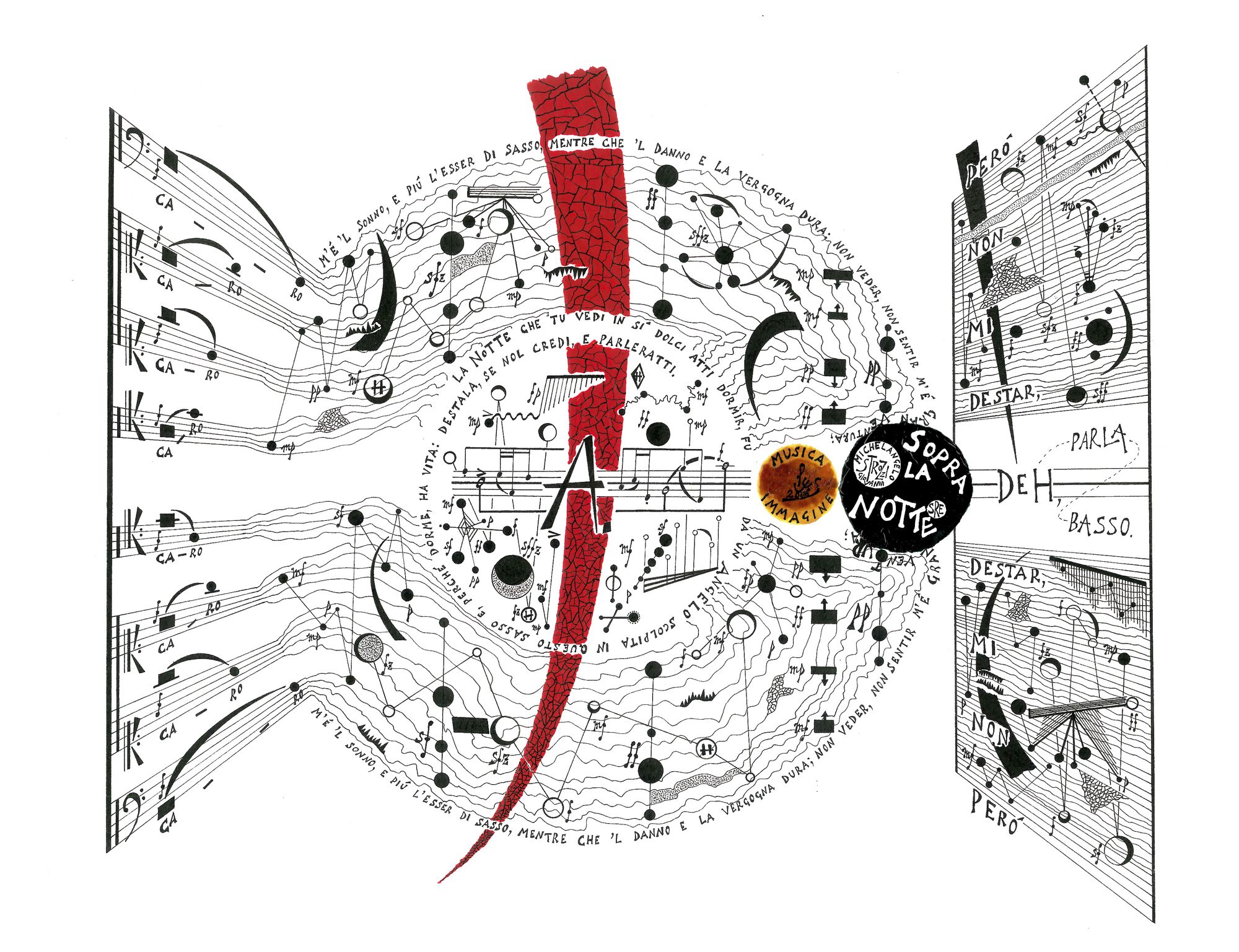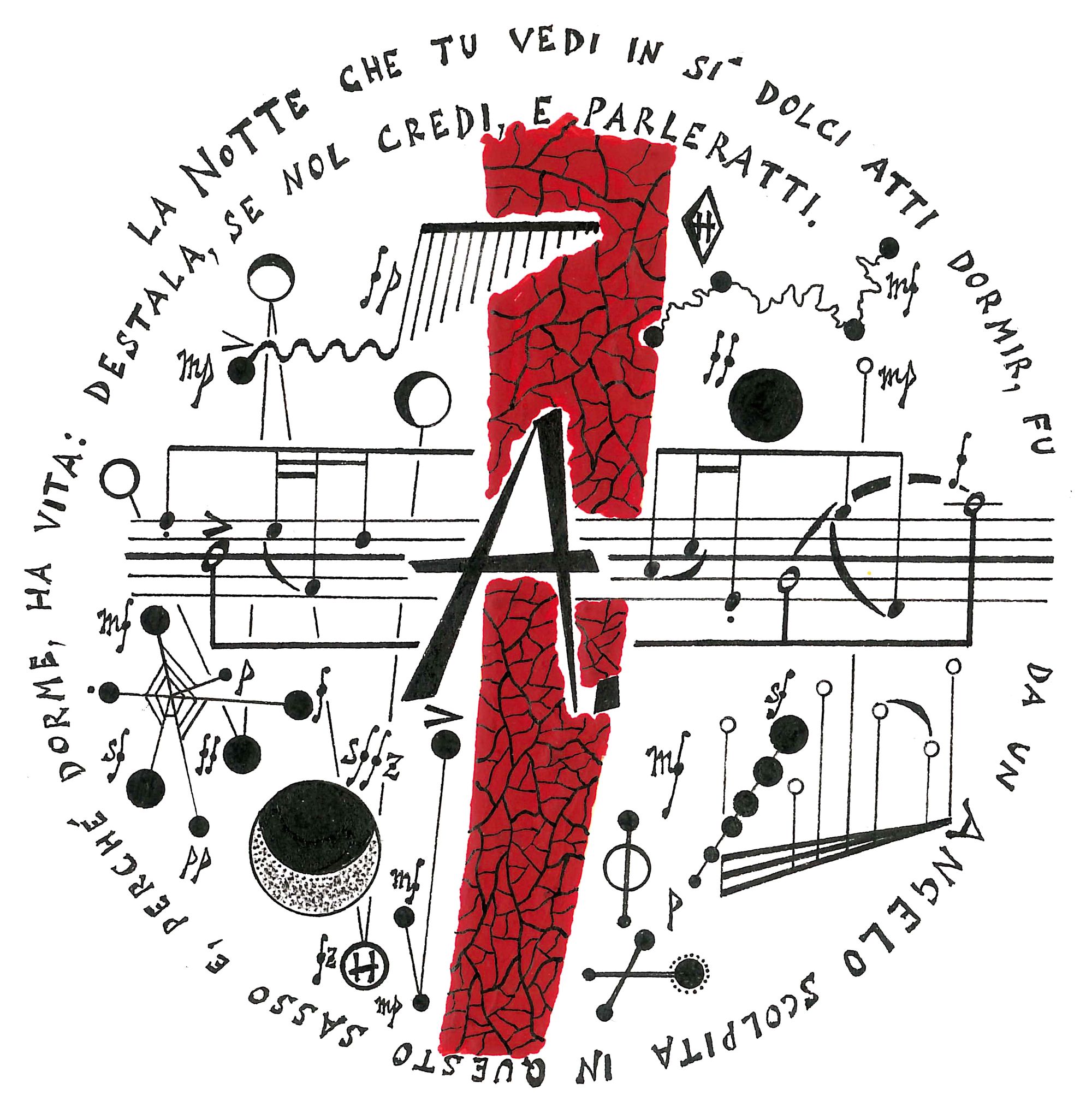 Mi ha sempre affascinato una frase di Rilke, presente nelle Elegie Duinesi, che qui riporto cifrata: «La bellezza è solo la maschera del tremendo». Per me la bellezza è generata dal sublime, e sappiamo che il sublime contiene anche il tremendo. Il pittogramma esteticamente più bello, secondo me, deve contenere una drammaturgia segnica che vada verso questo modello, il modello del sublime, ma soprattutto dev’essere in armonia con tutti gli altri segni presenti nella pagina. Certo, esistono pittogrammi belli nei termini della pura dimensione pittorica, ma non credo si possa decifrare quale sia il più bello in assoluto, anche perché ogni segno o simbolo esprime la sua bellezza se è in relazione con tutti gli altri. Potremmo invitare il lettore ad eleggere il proprio pittogramma, consigliandolo di visionare pagine di Bussotti, Lombardi, Pennisi e, se ne avesse voglia, un frammento di Sopra la Notte, una mia opera per coro a cappella su testo di Michelangelo che scrissi nel 2008, dalla quale è stata realizzata anche un’acquaforte a tiratura limitata.