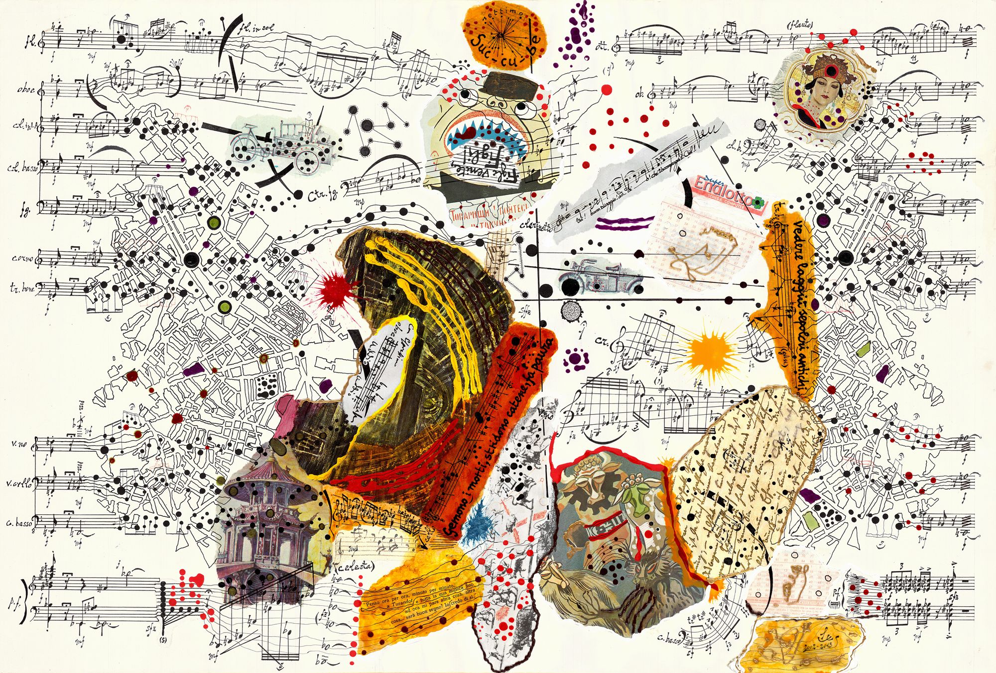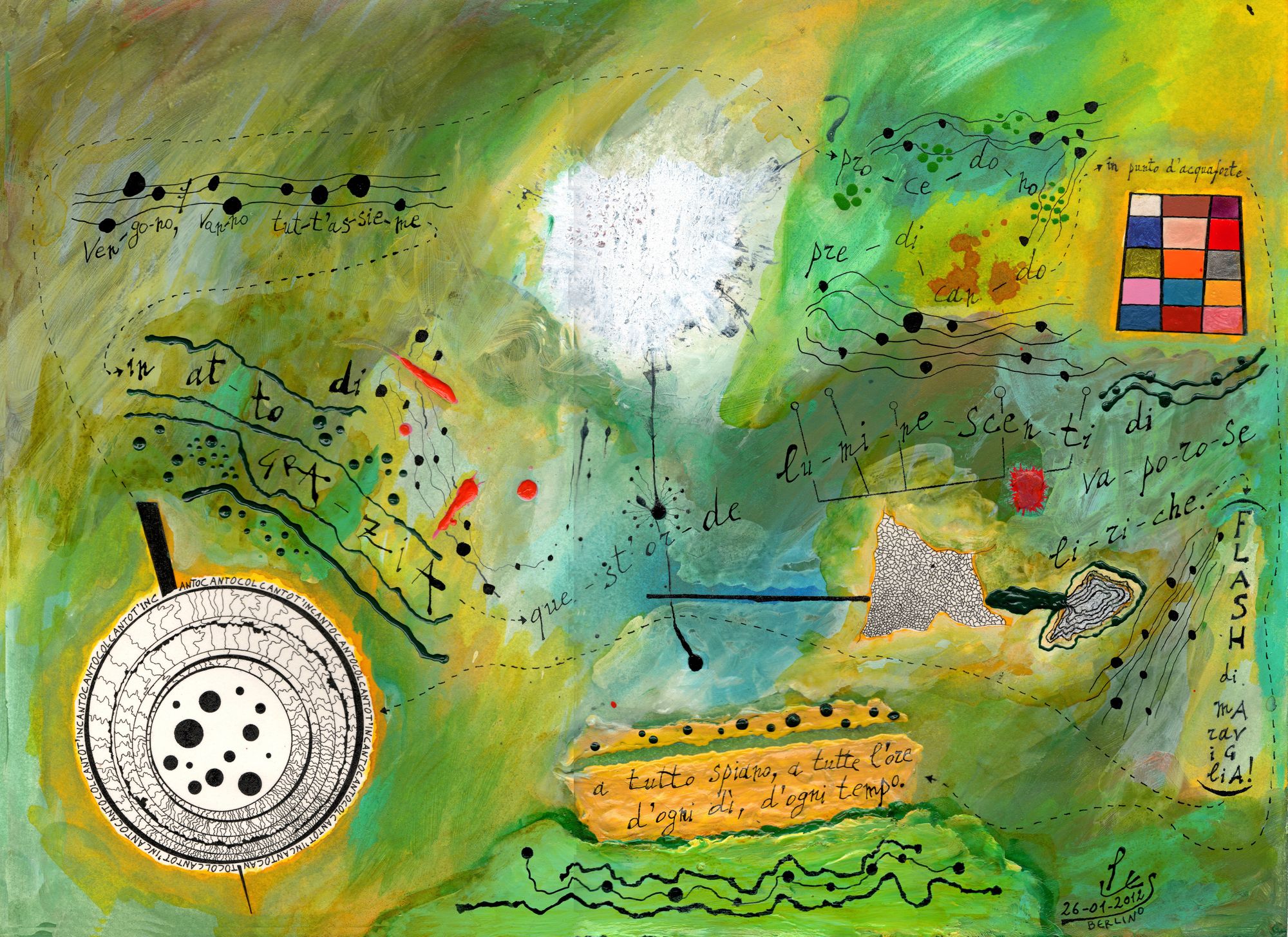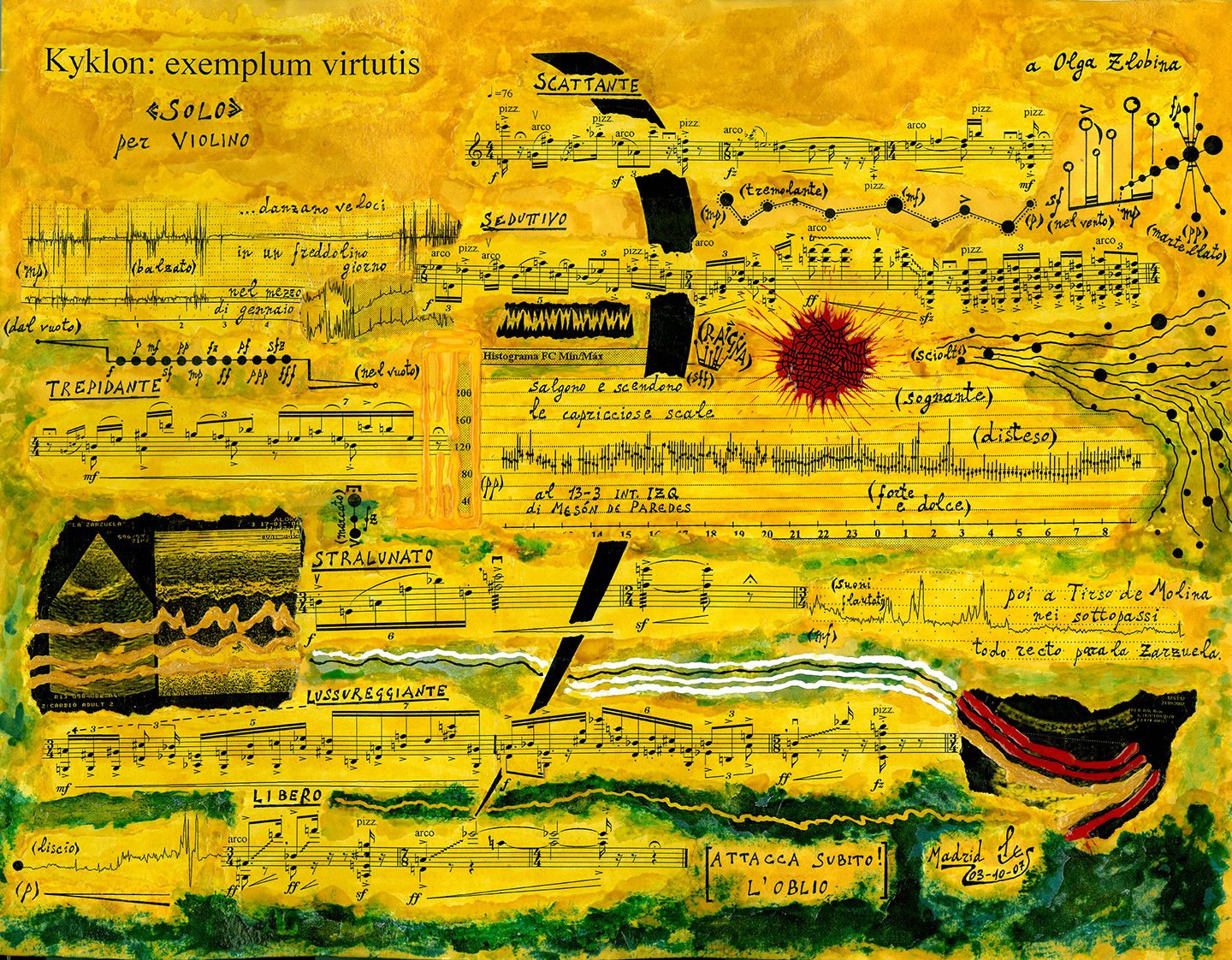 Fin dagli anni Ottanta, anni di apprendistato, ho avuto l’esigenza di scrivere pagine legate all’azione scenica, al gesto teatrale, che avessero prerogative performative molto aperte, con un segno grafico preciso, incisivo, e allo stesso tempo interpretabile in modo soggettivo, cosicché ogni esecuzione potesse risultare un unicum creativo. Questa esigenza l’ho potuta soddisfare soprattutto con la scrittura pittografica, sia manuale, sia virtuale. Per me è stata una scelta non solo di valenza estetica e di tecnica compositiva, ma innanzitutto una scelta di comportamento creativo. Dal punto di vista operativo, a differenza delle altre tecniche compositive, quando si inizia a scrivere una pagina pittografica si crea una sinergia tra il foglio (se del foglio si tratta, ma può essere qualsiasi altro supporto), la materia (inchiostri, colori, frammenti per collage, oggetti di qualsivoglia natura, etc.), il gesto d’azione (la scrittura), e il pensiero. Mentre negli altri sistemi compositivi la tecnica di scrittura (conoscenza dei fattori armonici, timbrici, sonori, acustici, etc.) è unita al solo pensiero creativo (che spesso si fonde con essa e che smuove le risorse di questa tecnica), nel caso della scrittura pittografica si crea anche un rapporto di natura corporea, tangibile e immancabilmente vengono chiamati in gioco tutti i sensi del corpo. A volte si è assolutamente cosciente di entrare in uno stato di “transfert creativo”, di non sapere quali saranno i cammini da percorrere, quali saranno gli incontri lungo il cammino, quali saranno i limiti. Per questa ragione è assolutamente inevitabile un’azione performativa, corporea, nell’interpretazione di una partitura pittografica. Anzi dirò di più, le pagine pittografiche che inserisco nelle mie opere, spesso fanno da trait d’union tra scrittura tradizionale, linguaggio elettronico e video art, portando a compimento una multimedialità d’azioni in continuo fermento per rinnovarsi. La mia primissima partitura con elementi pittografici è Segmenti, sul nome di CAGE, per pianoforte e otto segmenti; risale al 1994, un gioco sonoro gestito su un Anello di Moebius, arricchito di simboli grafici, colori e rimandi visivi. Questa pagina impressionò molto Sylvano Bussotti. Ricordo che, quando lo conobbi nel 1996, con la partitura tra le mani, disse: «Non è un caso che ci siamo incontrati». Bussotti mi volle come suo allievo ai corsi G.A.M.O. a Firenze. Grazie a questa frequentazione e a questa collaborazione, portate avanti negli anni e che mi hanno permesso di scrivere una corposa biografia su di lui (Un male incontenibile, Sylvano Bussotti artista senza confini; Bietti, Milano 2013), ho avuto modo di sviluppare questa scrittura approfondendone aspetti tecnici, elementi stilistici, fattori timbrico/sonori legati ai dettami del segno e alle varianti del colore.