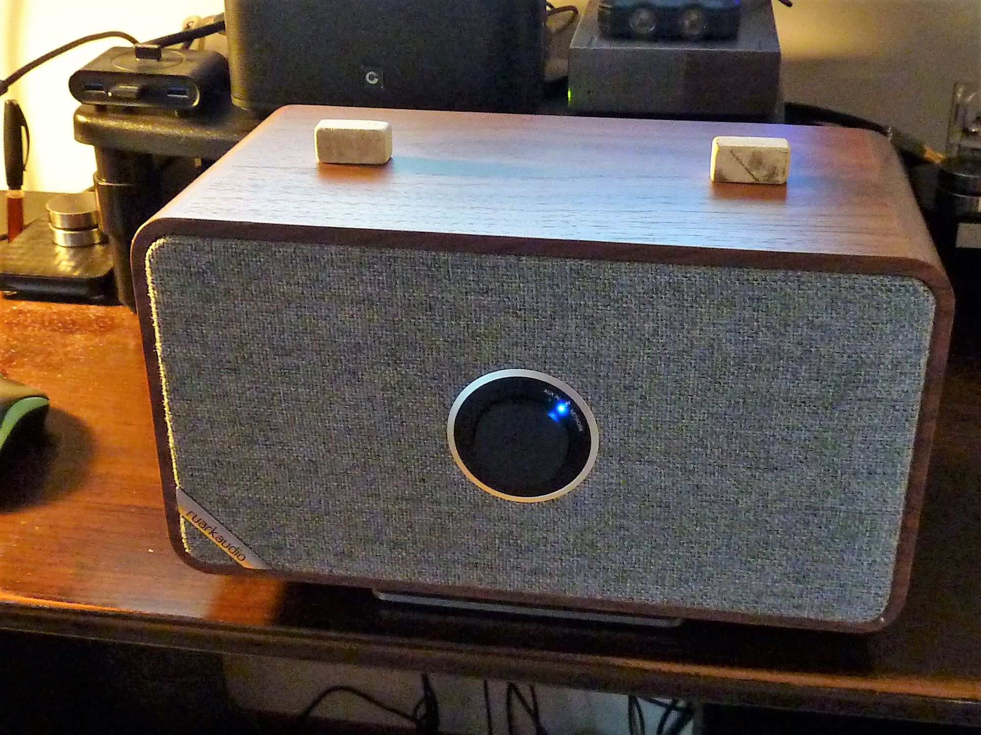Dapprima ho voluto provarli su un ottimo diffusore amplificato Bluetooth, per la precisione il Ruark MRx, ideale per gli ascolti di qualità con impianti da scrivania, collegato per esempio con un PC. Questo diffusore ha un ottimo registro medio-alto (il migliore della sua categoria), ma è leggermente meno potente nell’emissione del basso, anche se è molto controllato e preciso. Ebbene, utilizzando due Mini Stones sopra il diffusore (come si vede nell’immagine) e uno sotto, vicino al sistema di amplificazione, non solo la dinamica e il palcoscenico sonoro sono migliorati (la prima è risultata più naturale, con meno enfasi, e più veloce nei transienti, il secondo è risultato più focalizzato e con maggiore profondità), ma pur essendo un diffusore con due trasduttori da 75 mm. al neodimio, ha saputo restituire un dettaglio e una presenza fisica degli strumenti e delle voci in modo davvero sorprendente, esaltando anche e soprattutto il registro grave, che è risultato essere più scolpito e veloce, oltre che più articolato.