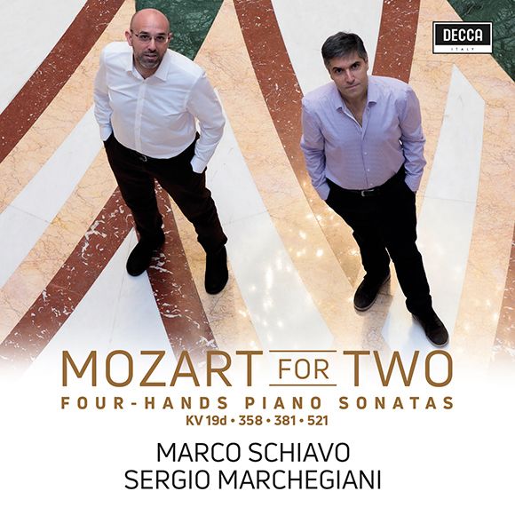 Se parlo di questo repertorio del catalogo mozartiano è per merito del duo Marco Schiavo & Sergio Marchegiani (abbiamo intervistato quest'ultimo), che in tale ambito musicale rappresentano un autorevole e inestimabile punto di riferimento, il quale ha dato inizio alla registrazione integrale delle opere per pianoforte a quattro mani del genio salisburghese con l’etichetta discografica Decca. In questo primo CD, Schiavo & Marchegiani hanno inciso la Sonata in do maggiore K19d, la Sonata in si bemolle maggiore K358, la Sonata in re maggiore KV381 e la Sonata in do maggiore KV521, fornendo già in tal modo una visione d’insieme del processo compositivo mozartiano.