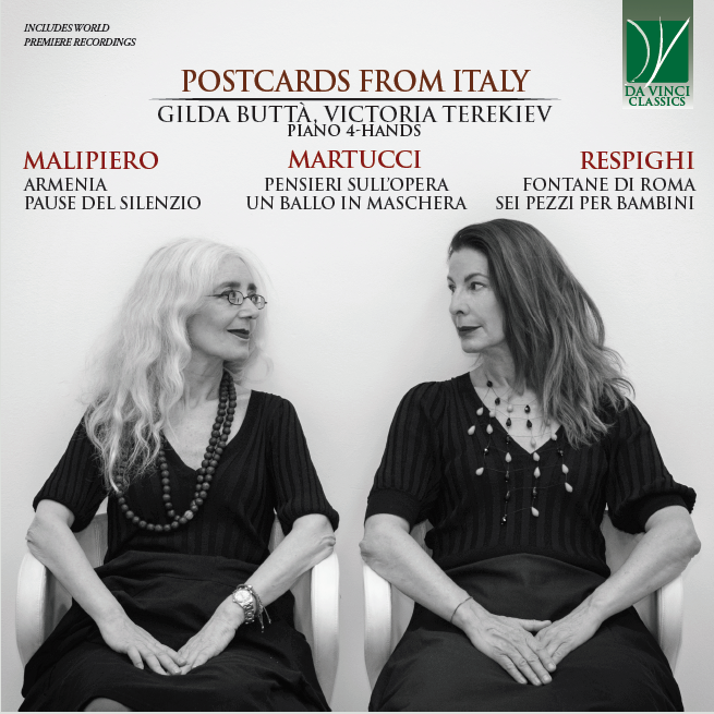 Questo perché il pianoforte, per i compositori europei di fine Ottocento e inizio Novecento, fu lo “strumento-madre” con il quale irradiare la loro “civiltà musicale”. Questa idea di “riconducibilità” di un qualcosa che torna, prima o poi, sempre a questo punto di origine, ossia di una materia sonora che, sebbene creata per fini orchestrali e sinfonici, torna nella sua integralità espressiva per raccontare “altro”, la troviamo esemplarmente esposta in una registrazione della Da Vinci Classics che vede un duo femminile, dunque squisitamente bachofeniano, formato da Gilda Buttà e Victoria Terekiev, presentare opere di Ottorino Respighi e Gian Francesco Malipiero, composte per orchestra, nella trascrizione per pianoforte a quattro mani effettuata dagli stessi compositori, vale a dire il poema sinfonico Fontane di Roma e i Sei pezzi per bambini del musicista bolognese, e le rare pagine Armenia, Canti armeni tradotti sinfonicamente e Pause del silenzio, sette espressioni sinfoniche di quello veneziano (entrambe incise in prima assoluta mondiale), così come Pensieri sull’opera “Un ballo in maschera” di Giuseppe Verdi op. 8, pagina giovanile di Giuseppe Martucci, anch’essa in prima assoluta, autore che precede anagraficamente quelli della generazione “dell’Ottanta”, votato sia al pianoforte, sia alla produzione orchestrale.