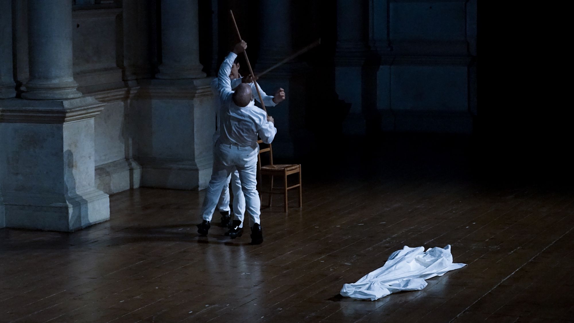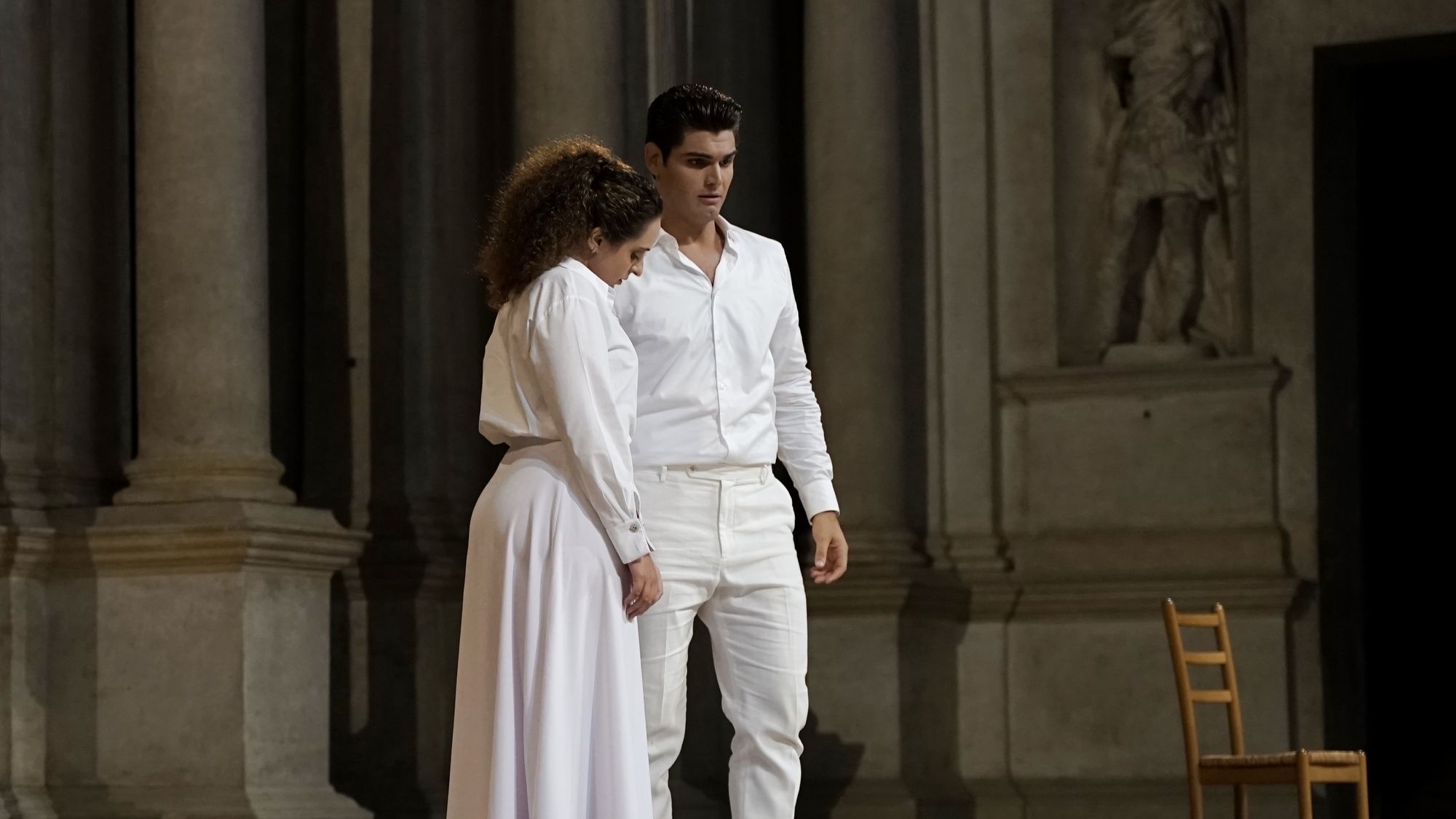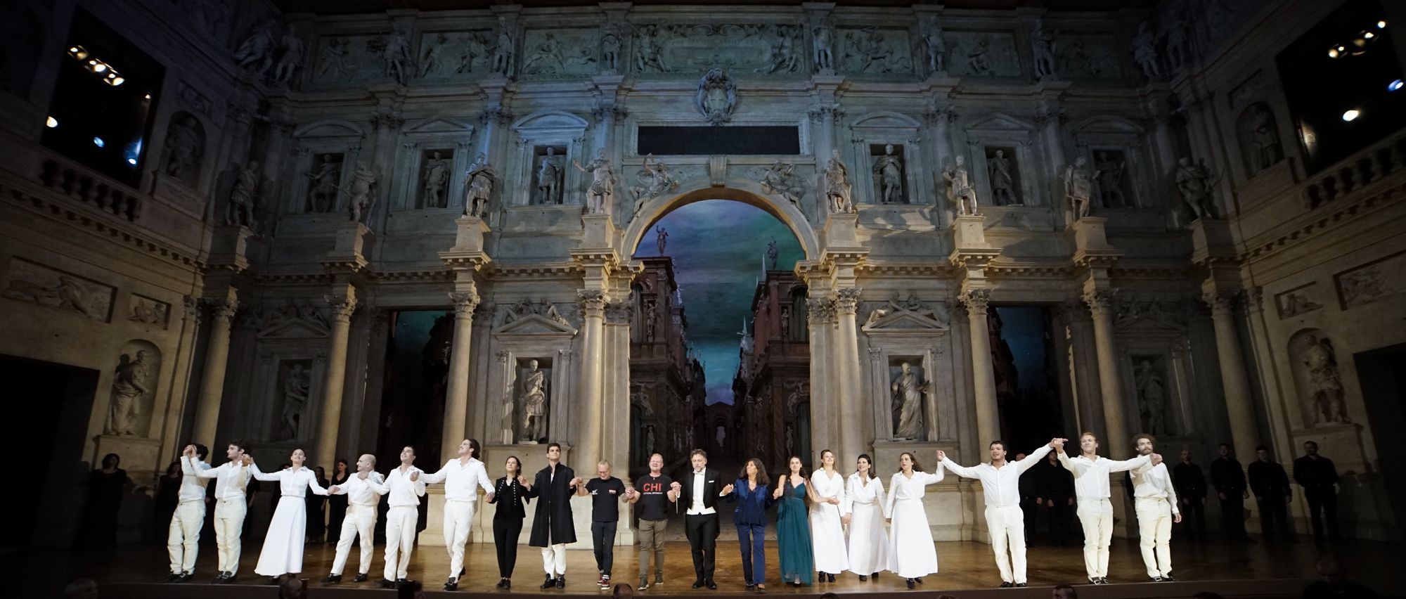 Per le scene e i costumi, la scenografa Leila Fteita ha assunto una posizione estremamente minimalista, due sedie e qualche oggetto di scena alla bisogna, abbigliamento bianco per tutti i personaggi e un mantello nero nel secondo atto per Don Giovanni (un colore che tende a simboleggiare maggiormente l’animo “scuro” del personaggio). Scelte sobrie quanto rischiose che sarebbero state discutibili al di fuori dell’Olimpico ma, così come ha fatto notare il Direttore Artistico Andrea Castello, che si sono adattate idealmente con il proscenio del Palladio e con le scene lignee di Scamozzi (è bene ricordare che Palladio morì l’anno di inizio dei lavori di costruzione del Teatro, senza lasciare appunti sulla scena “a prospettive” richiesta dall’Accademia). Elementi di scena, oltre che semplici figuranti, i mimi Rebecca Sisti, Luca Rossi, Giambattista Ferro, Emmanuele Ottaviani e Elia Perrotta: una presenza, la loro, a dir poco indispensabile a fronte di una regia così minimalista.