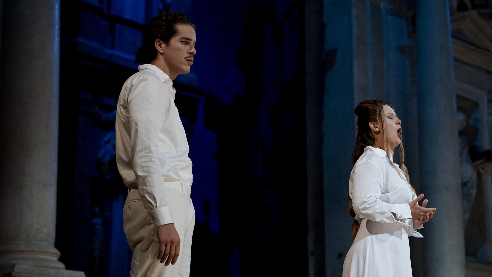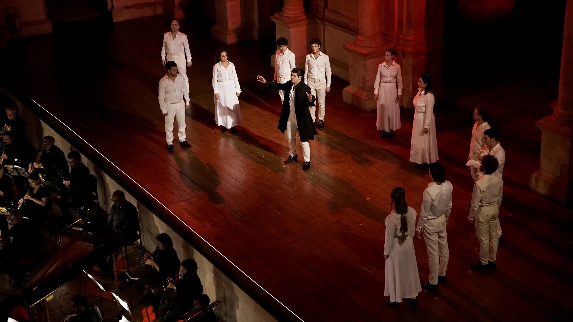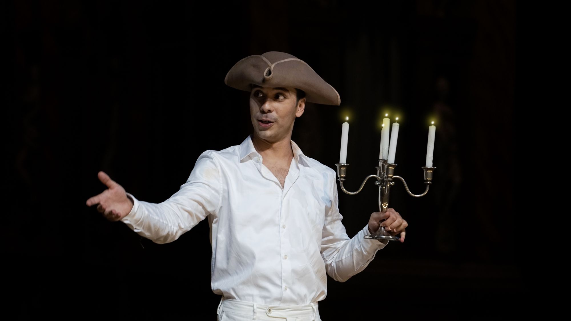 Per le scene e i costumi, la scenografa Leila Fteita ha assunto una posizione estremamente minimalista, due sedie e qualche oggetto di scena alla bisogna, abbigliamento bianco per tutti i personaggi e un mantello nero nel secondo atto per Don Giovanni (un colore che tende a simboleggiare maggiormente l’animo “scuro” del personaggio). Scelte sobrie quanto rischiose che sarebbero state discutibili al di fuori dell’Olimpico ma, così come ha fatto notare il Direttore Artistico Andrea Castello, che si sono adattate idealmente con il proscenio del Palladio e con le scene lignee di Scamozzi (è bene ricordare che Palladio morì l’anno di inizio dei lavori di costruzione del Teatro, senza lasciare appunti sulla scena “a prospettive” richiesta dall’Accademia). Elementi di scena, oltre che semplici figuranti, i mimi Rebecca Sisti, Luca Rossi, Giambattista Ferro, Emmanuele Ottaviani e Elia Perrotta: una presenza, la loro, a dir poco indispensabile a fronte di una regia così minimalista.
