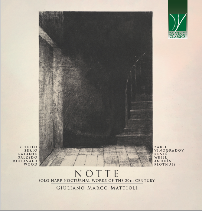 Leggendo la lista dei nomi-guida che l’arpista Giuliano Marco Mattioli, protagonista del disco Notte. Solo Harp Nocturnal Works of the 20th Century, pubblicato dalla Da Vinci Classics, ha elencato nelle sue note di accompagnamento, ho capito fin da subito che mi avrebbe atteso un ascolto proficuo, basato non solo su un sentiero costellato da diversi autori del Novecento storico e di quello più vicino a noi, ma soprattutto basato su uno spessore speculativo che è, come ricorda il filosofo della musica Vladimir Jankélévitch (guarda caso, citato anch’egli dall’artista di Lovere), il fine ultimo della vera, unica Musica. Ho tirato un sospiro di sollievo, tenuto conto che non avrei dovuto a che fare con puttanate salottiere o con minestre trite, ritrite e sbattute in faccia nel loro riscaldarsi senza soluzione di continuità.